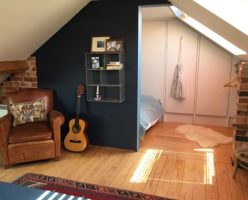 The third floor is an open plan converted attic, available as the 5th bedroom or work space, with wooden floors and skylights. Off the attic is ample storage in a loft space stretching the width of the room.