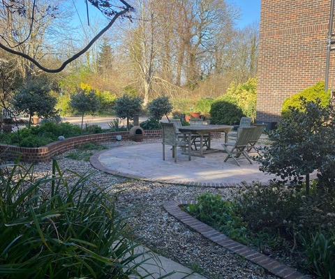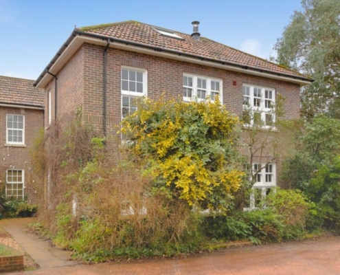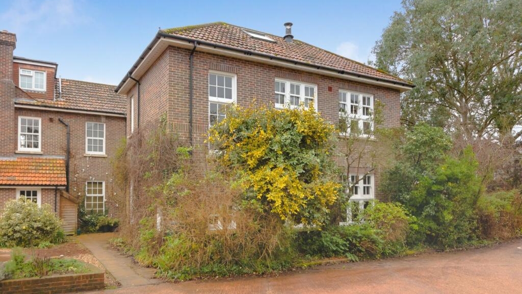 The ground floor has been architecturally configured to create a spacious downstairs living space, generous sized kitchen, extra bedroom/office space, and downstairs loo and shower room. The sitting room is double aspect, and like the kitchen, opens onto a quiet south-west facing patio with pergola, with far reaching view to the gardens and trees of the communal land, and a small semi-enclosed grass area with small pond, flower bed and mature shrubs.