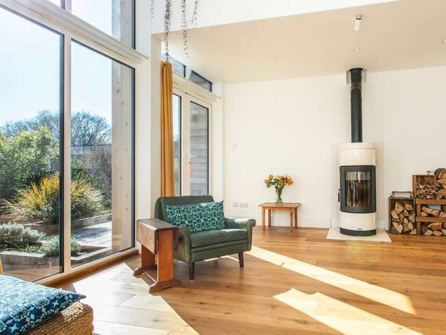 A 26-foot kitchen and dining space opens directly onto the garden and forms the centre of the house. The sitting room is vaulted, calm, and can be made cosier on winter nights with the wood-burning stove. Windows, extending from ground floor to the top of the gable end, give views of the landscape throughout the day and into the evening. There is underfloor heating on the ground floor and central heating upstairs.